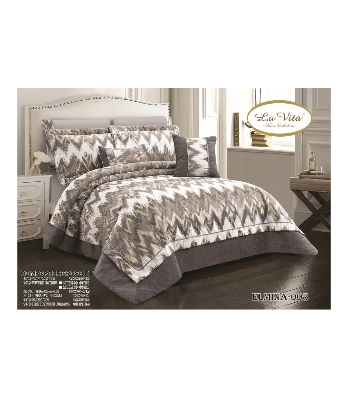 سرویس روتختی لاکچری دونفره 8/هشت تکه با جنس نخ پنبه کتان به رنگ طوسی روشن ، با طرح زیگزاگ مدرن از برند لاویتا(LAVITA) مدل المینا(ELMINA) است که یکی از شرکت های برتر در تولید روتختی و محصولات خواب می باشد.