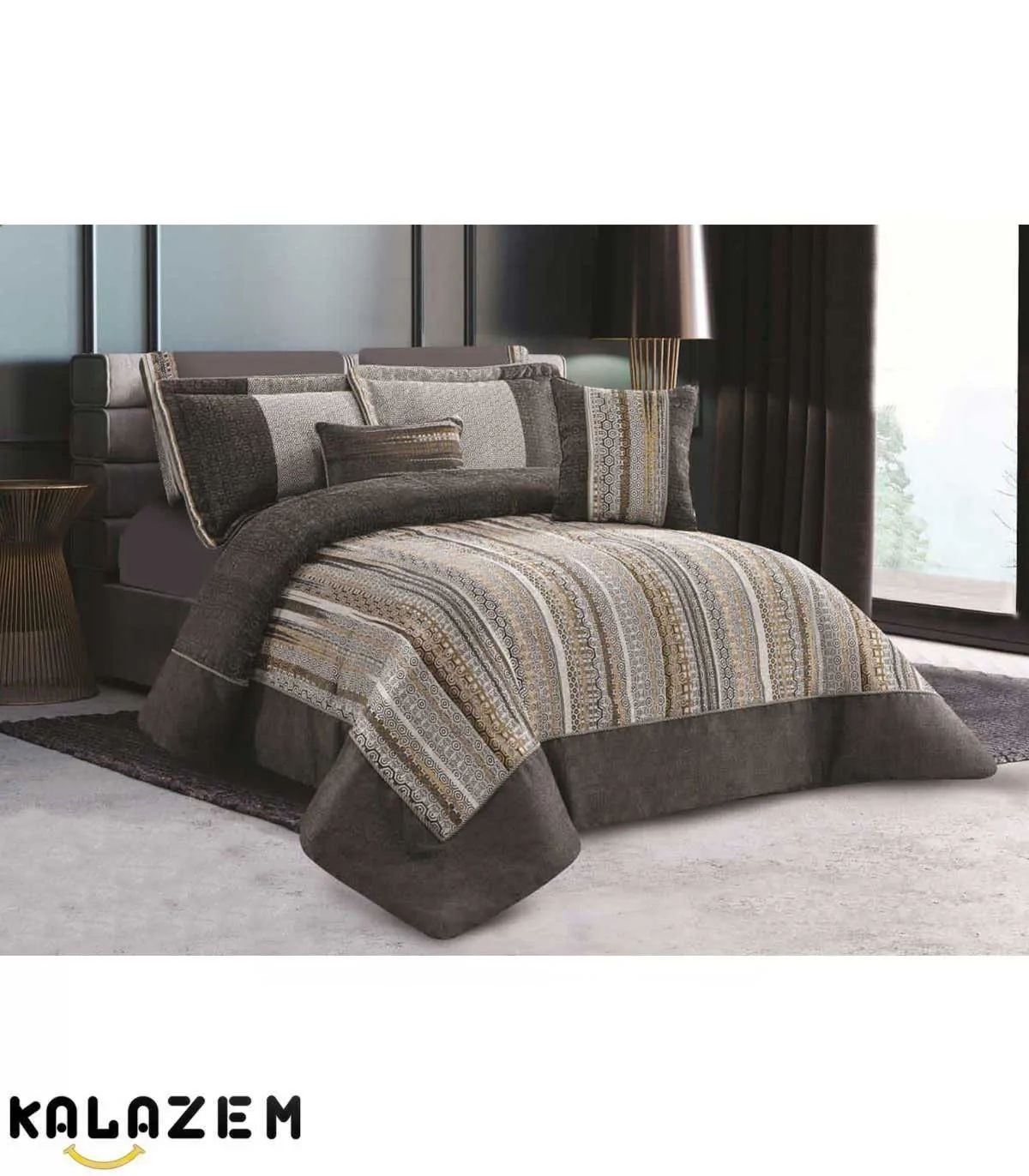 سرویس روتختی لاکچری دونفره 8/هشت تکه با جنس مخمل کتان و دورو می باشد که به رنگ زغالی، با طرح هندسی از برند لاویتا (LAVITA) مدل آنجلینا(ANGELINA) است که یکی از شرکت های برتر در تولید روتختی و محصولات خواب می باشد.